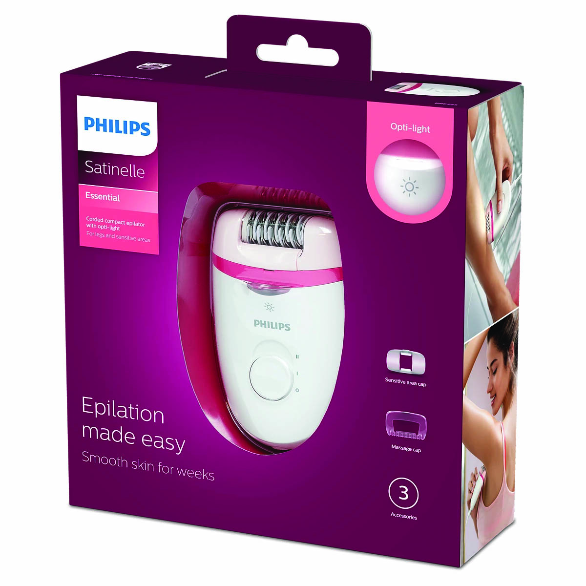 DEPILADORA COMPACTA CON CABLE, 15V,LUZ OPTI-LIGHT, 3 ACCE,BLANCO ROSA