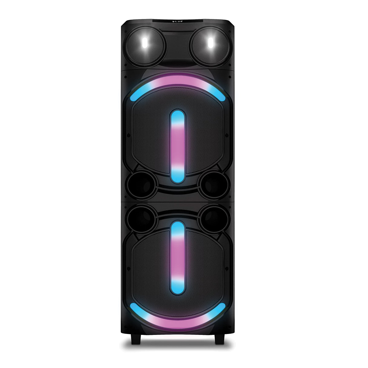 Su diseño pensado para el entretenimiento también incorpora entradas dedicadas para micrófono y guitarra, ideal para karaoke o presentaciones en vivo. Los dos woofers de 12″ garantizan potencia y presencia en los tonos bajos, haciendo que cada ritmo se sienta con más cuerpo.